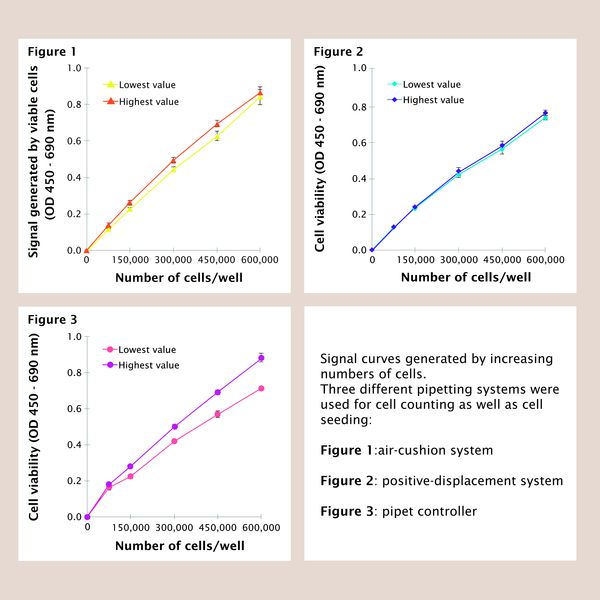 細胞接種的再現性隨使用的移液系統而變化。該圖顯示了相對于氣墊移液管(黃色),正位移系統(藍色)和移液管控制器(紅色)的種子細胞數的活細胞信號。