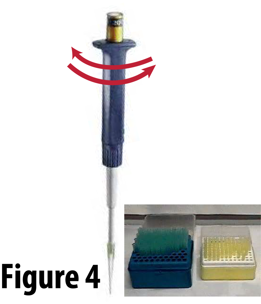 移液器頭 (tip),P1000 使用藍色微量移液器頭,P200 及P20 使用黃色微量移液器頭。套tip頭時一定注意 ,動作要輕柔,不可粗暴。可以先將套上,然后利用腕部力量在盒子里左右旋轉套牢,在此過程中保持微量移液器垂直(Figure 4)。